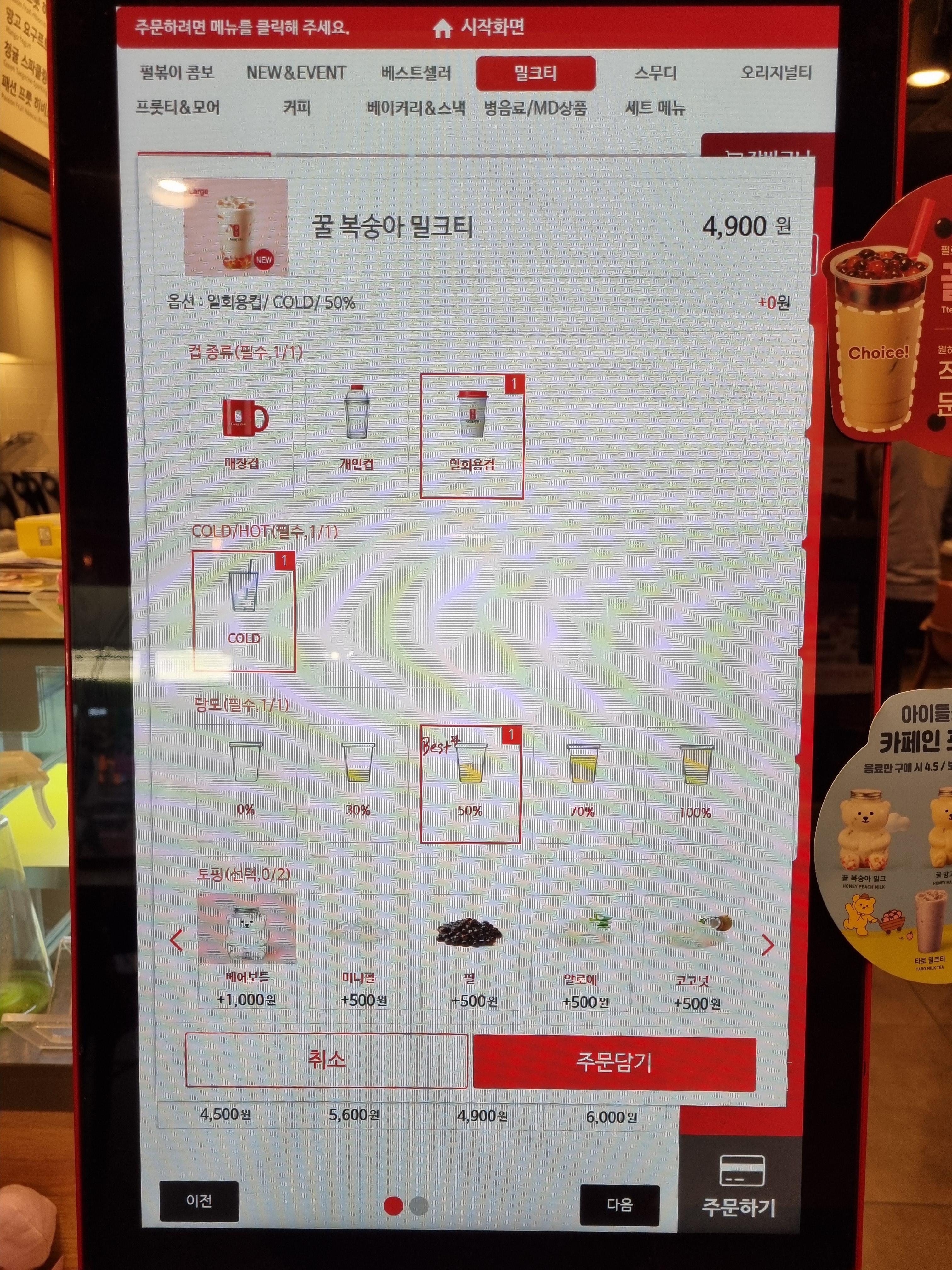 하지만 저는! 꼭 밀크티를 마시고 싶어 '꿀 복숭아 밀크티' 선택