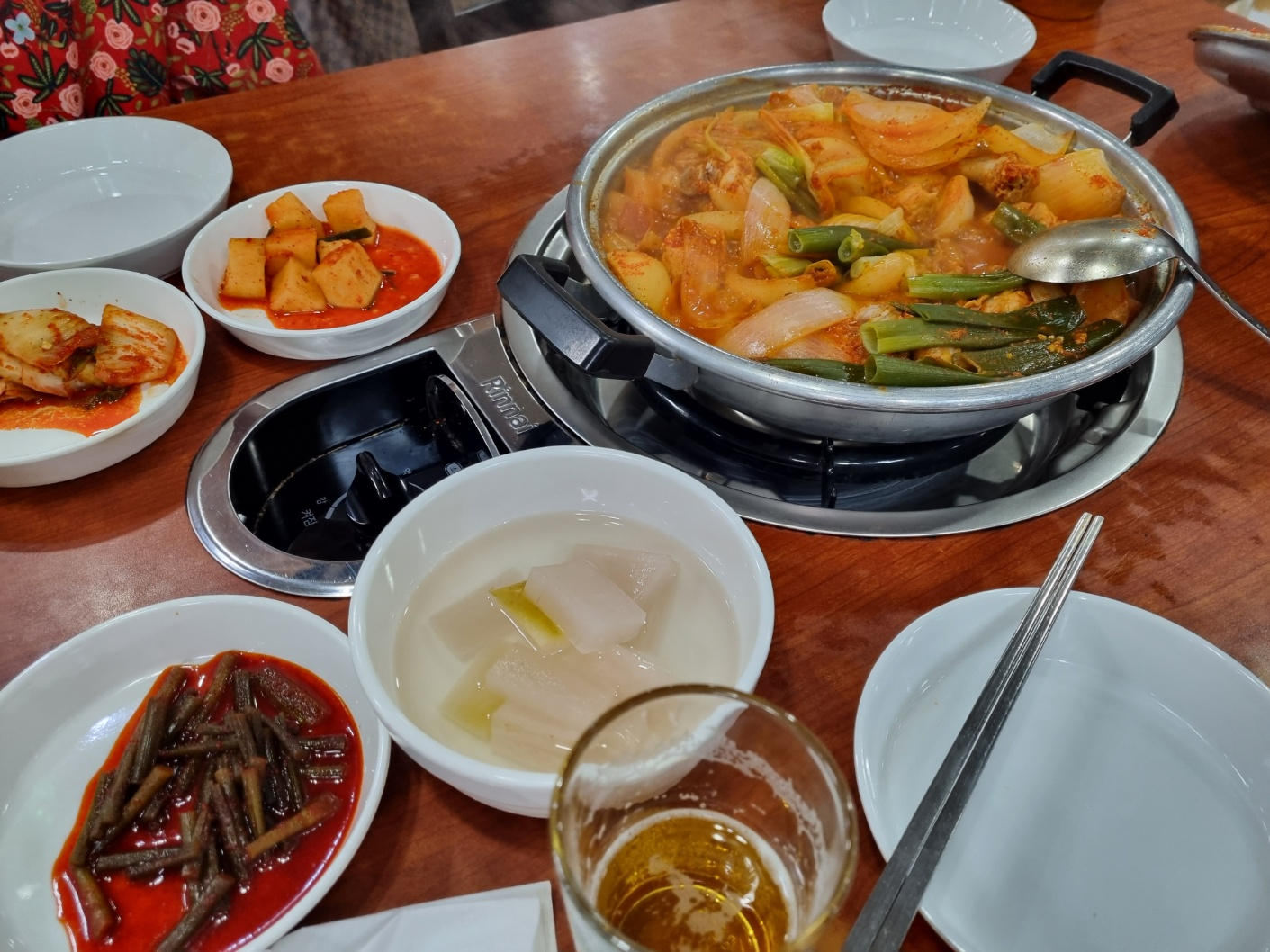 기본반찬이 김치, 깍두기, 동치미 + 마늘쫑 이었어요~