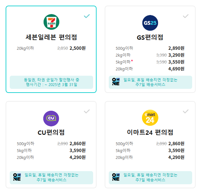 각 회사별로 장점을 가지고 있는데 현재 세븐일레븐 편의점에서 990원에 반값택배를 보낼 수 있는 이벤트를 진행 중입니다.(~2025.3.31까지)