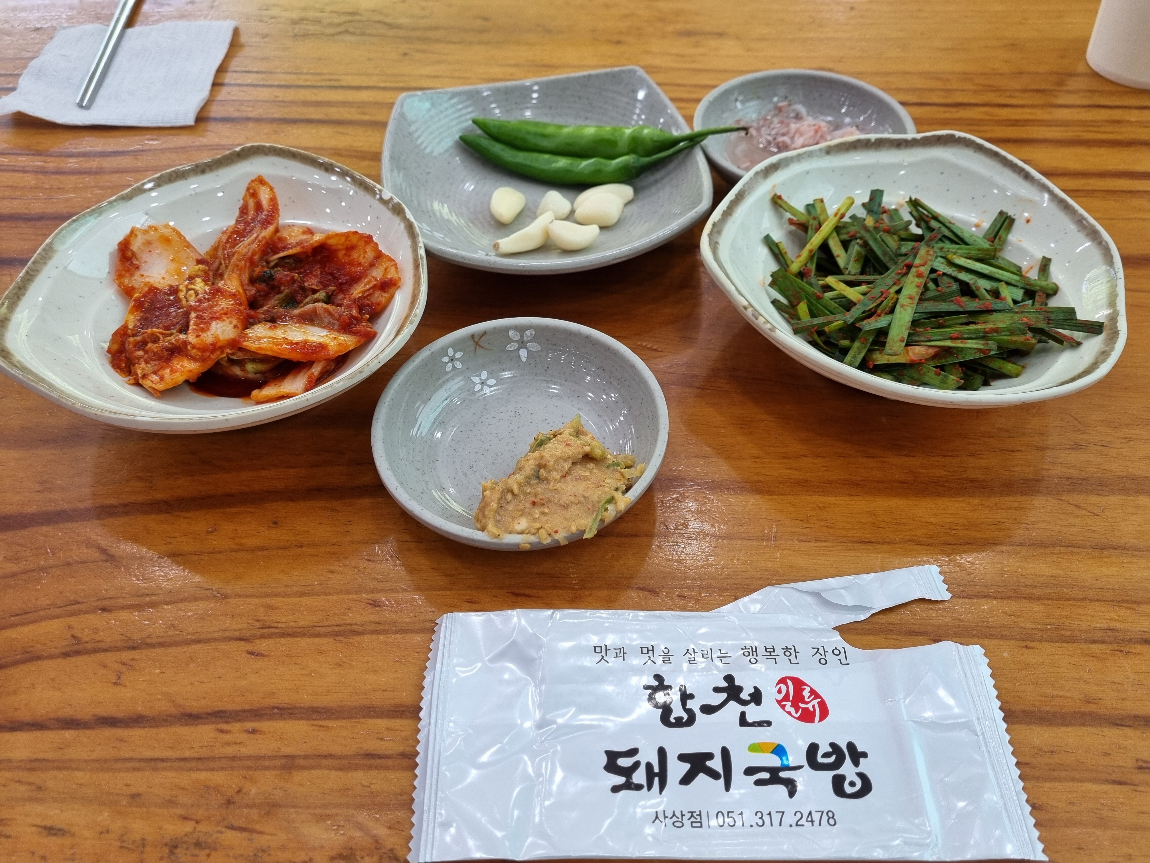 기본반찬은 일반적인 국밥집과 같이 정구지, 새우젓, 고추, 마늘 이 있고 김치는 옆에 통에서 꺼내먹으면 됩니다!