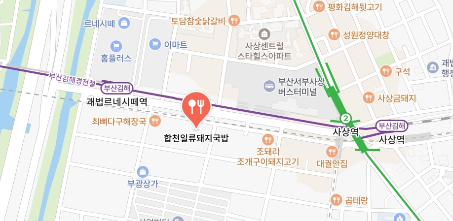 합천일류돼지국밥집 위치는 부산사상역(2호선)과 괘법르네시떼역(부산김해경전철) 사이에 있고