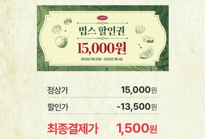 [11번가] [기프티콘] 빕스 15,000원 할인권 90% 할인 1,500원 VIPS