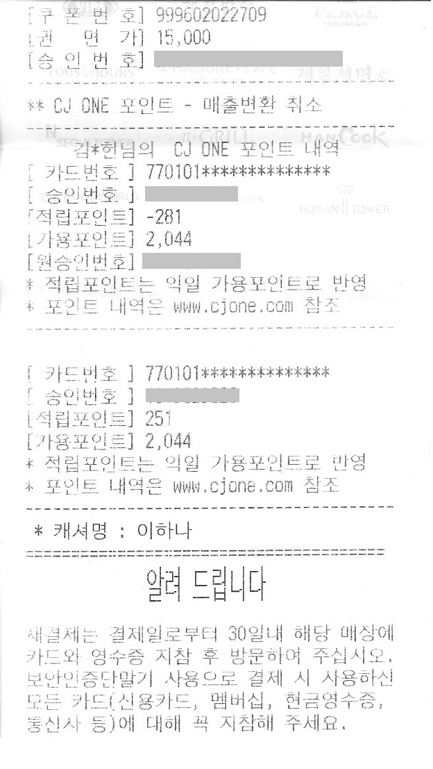 영수증 다시 확인해보니 포인트 차감이 안 맞아서