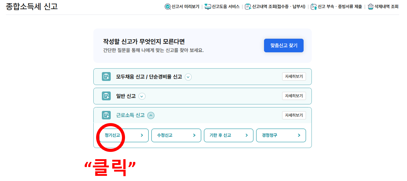 홈택스 접속(www.hometax.go.kr) ➡ 로그인 ➡ 우측상단 세줄 ➡ 종합소득세 신고 ➡ 근로소득 신고