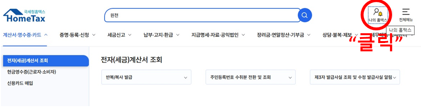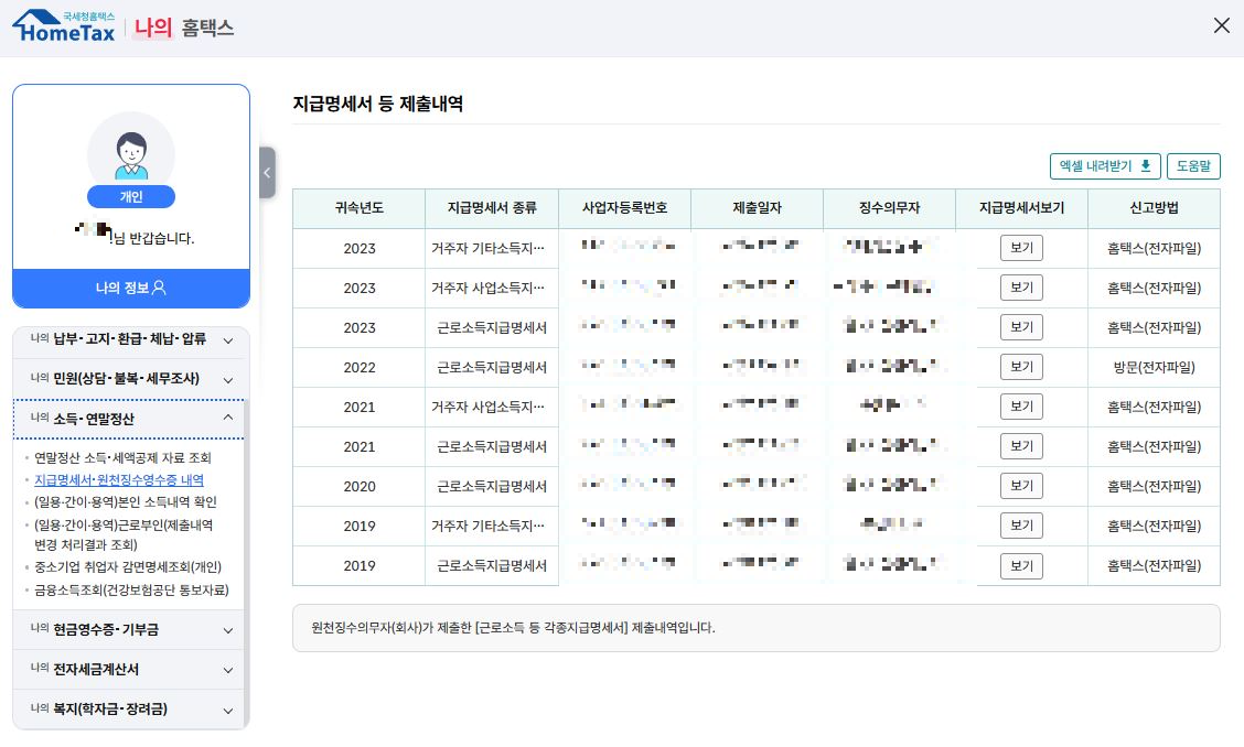 홈택스 접속(www.hometax.go.kr) ➡ 로그인 ➡ 우측상단 [나의 홈택스] 클릭➡ 소득/연말정산 ➡ 지급명세서·원천징수영수증 내역 클릭 및 조회 ➡ 지급명세서 [보기] 클릭
