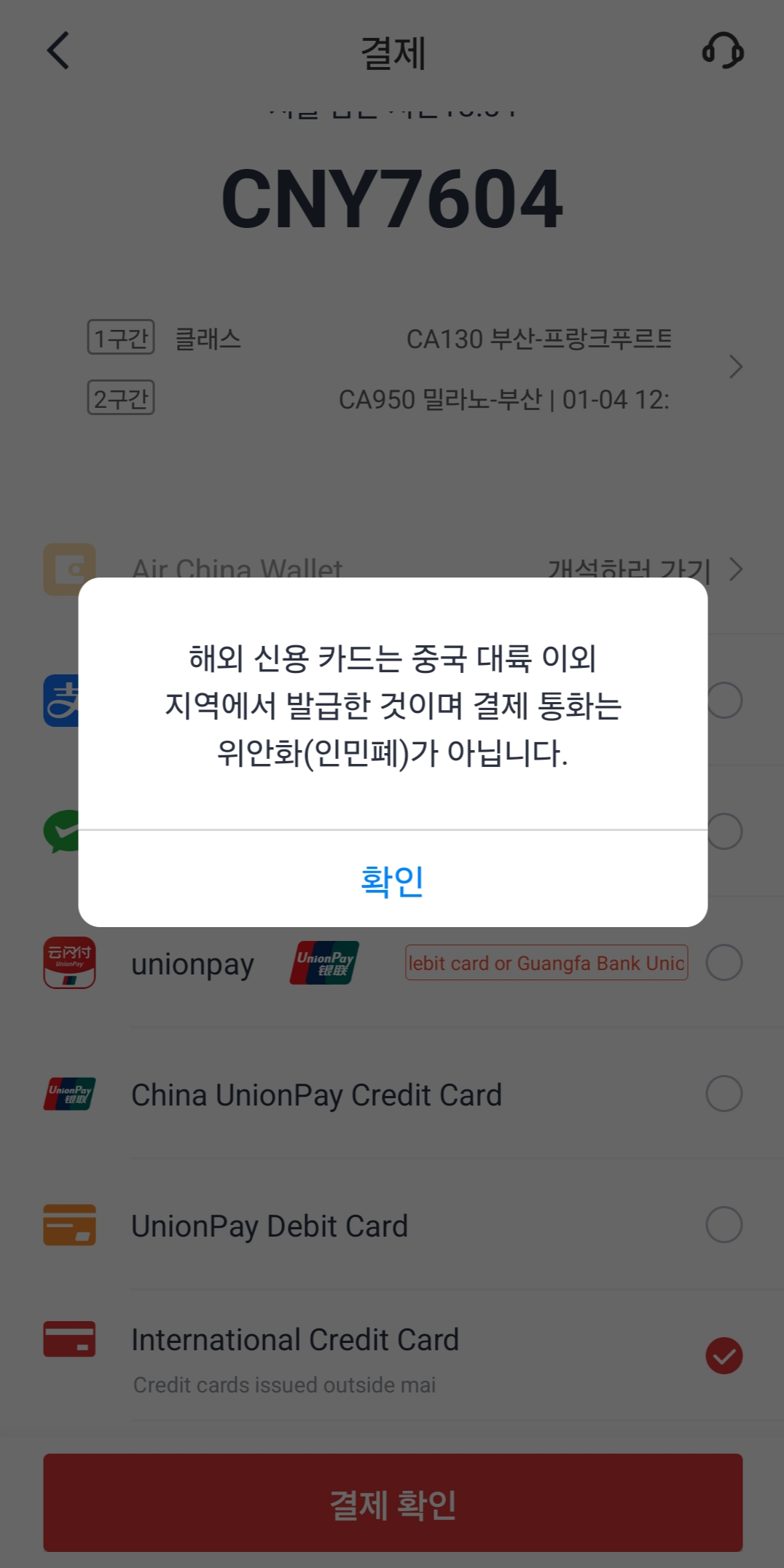 PC로 에어차이나 홈페이지에서 결제하려니까