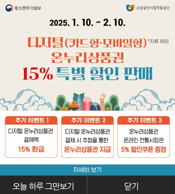 온누리상품권 최근에 15%까지 할인하고 15% 캐시백 해주는 이벤트 등 진행하고 있으니