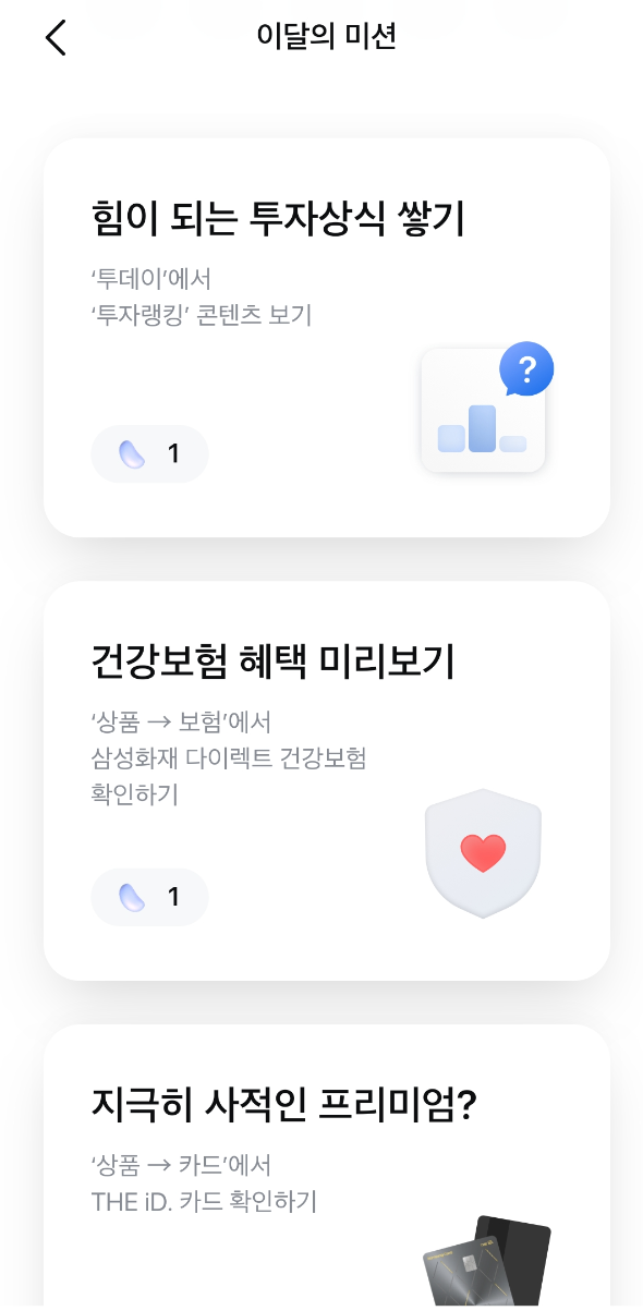 - 투자공부왕챌린지 : 삼성증권과 연계, 투자영상을 2~3분가량 보면 아래 수강인증하러가기 버튼 활성화 > 달성완료 클릭