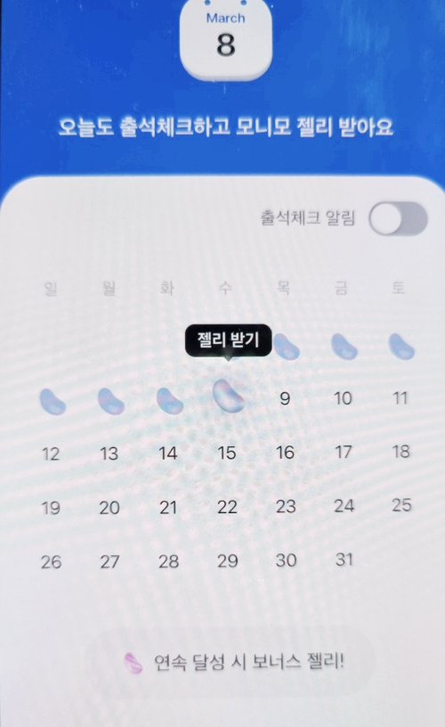 - 출석체크 : 매일 혜택 항목에서 출석체크를 하면 매일 1개씩 일반젤리 획득가능하며, 1달 동안 출석체크를 만근 완료하면 스페셜젤리 1개를 추가 획득가능