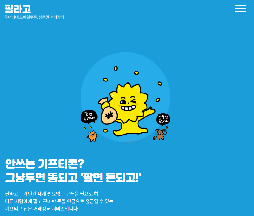 한국 내에서 가장 많은 고객들이 이용하는, 각종 기프티콘, 모바일쿠폰을 개인간 거래 할 수 있도록 제공하는 플랫폼 "팔라고" 앱 소개, 모바일쿠폰 거래방법, 사용시 유의사항에 대해 알려드리고자 합니다.