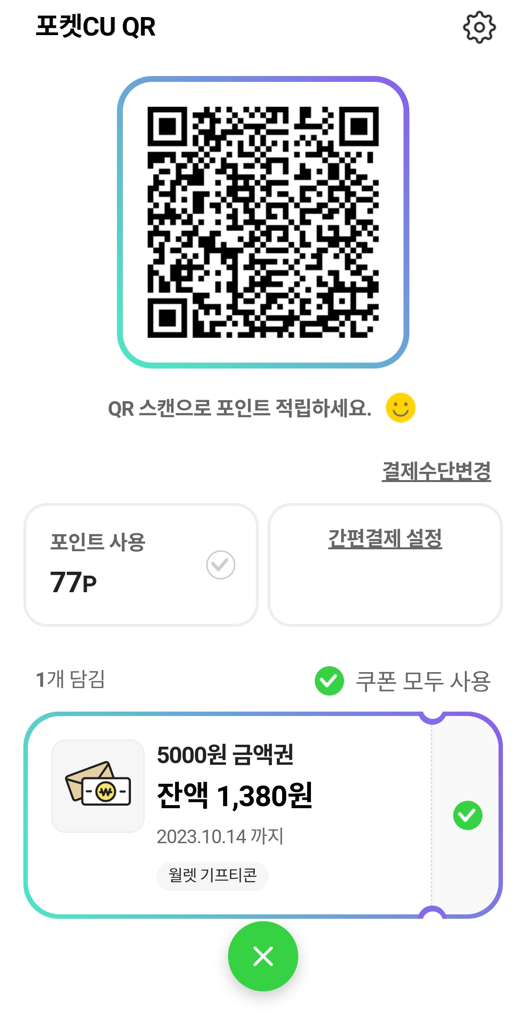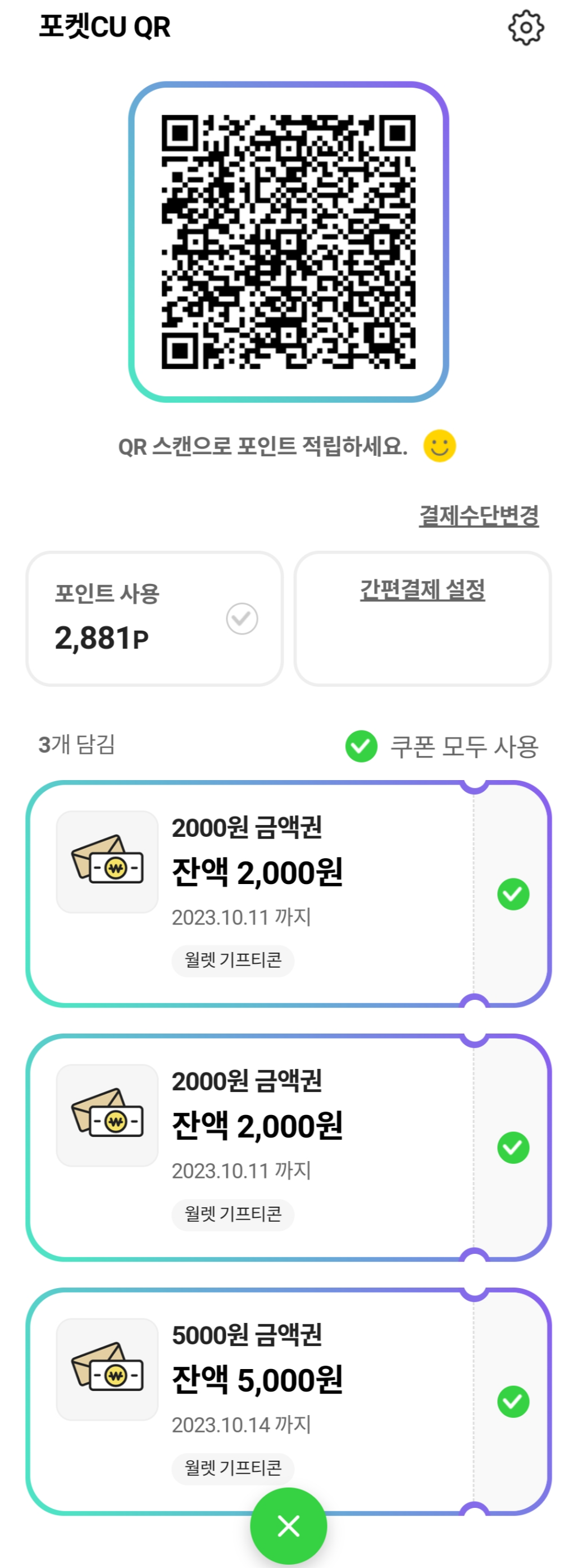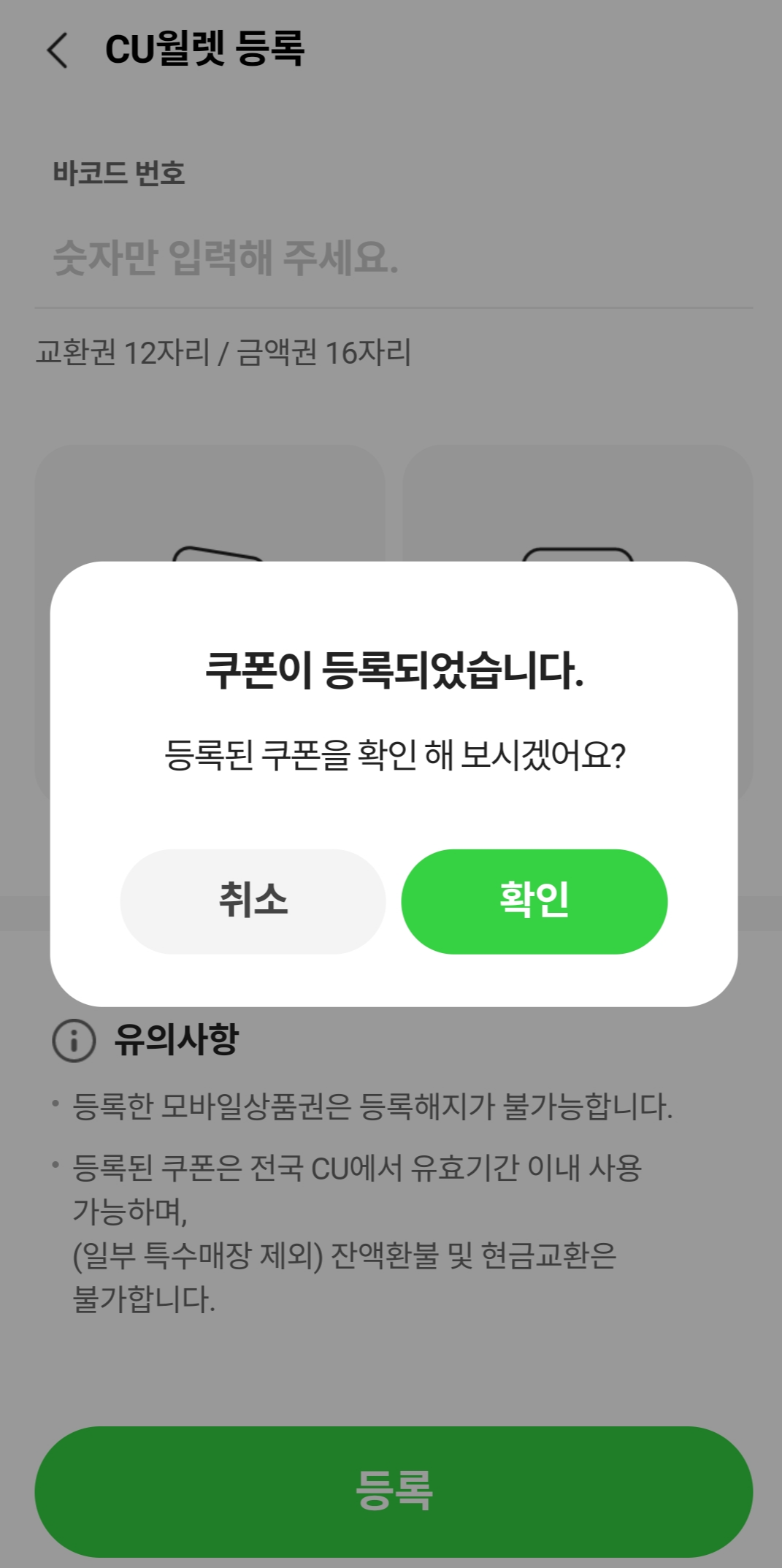 1. 포켓CU 금액권 등록시